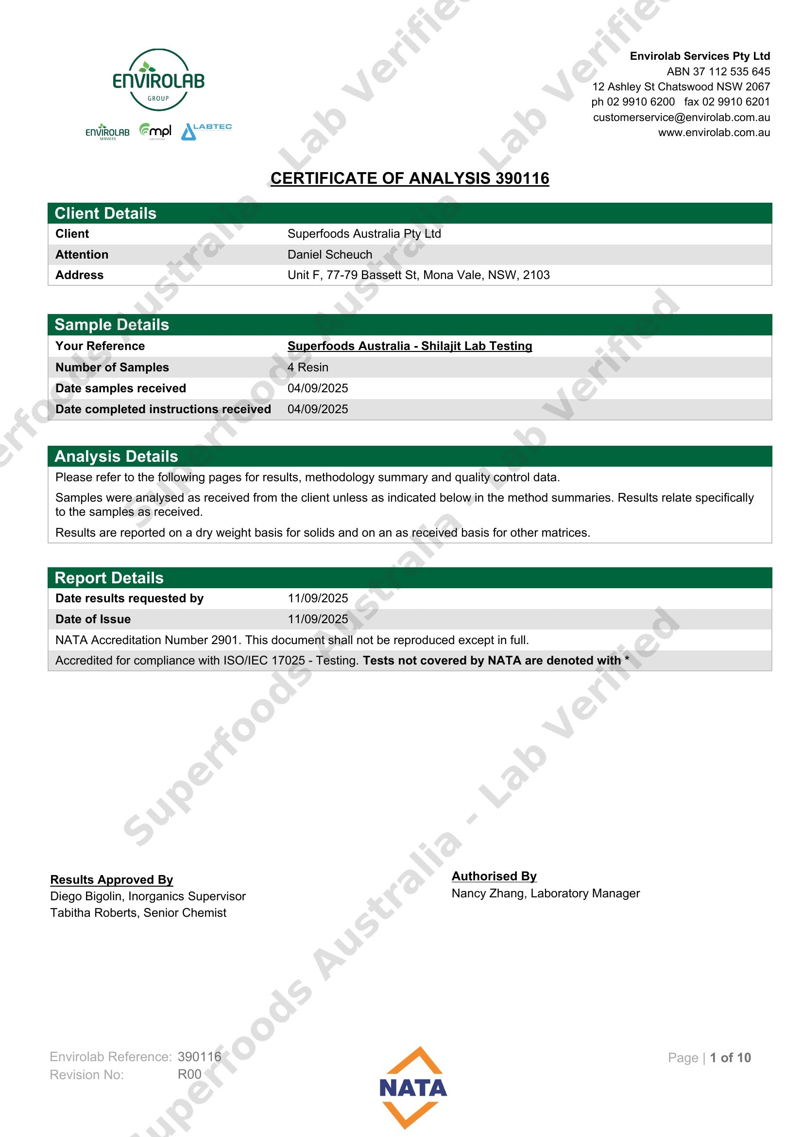 Here are Superfoods Australia's Shilajit Resin 3rd party lab tests. We regularly test to ensure the purity and potency of our products and to keep you safe.